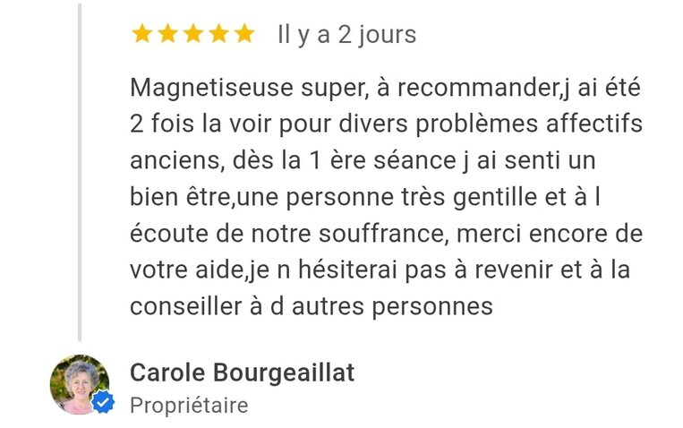 Je viens pour différents soucis de santé notamment une charge mentale énorme qui entraîne des contractures musculaires importantes et ce depuis plusieurs années : j'ai fait une dépression pendant 3 ans avec la prise de nombreux antidépresseurs et anxiolytiques : à ce jour je ne prends plus de traitement car j'ai décidé d'arrêter de dépendre de la chimie ! Mais je reste fragile ! C'est pour ça que je me suis tournée vers le magnétisme : en la personne de Carole, je trouve une oreille attentive, du réconfort, des conseils avisés et une grande douceur dans ses gestes et bien d'autres qualités que je vous laisse découvrir.