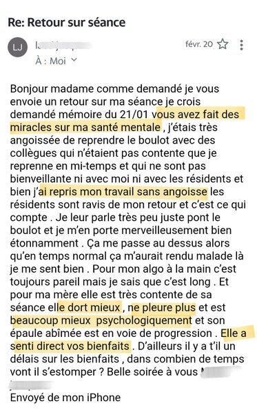 Dès le soir de la première séance, j’ai réussi à dormir une nuit compléte, dès le lendemain matin, j’arrivais à parler de cet évènement sans pleurer et être angoissée…