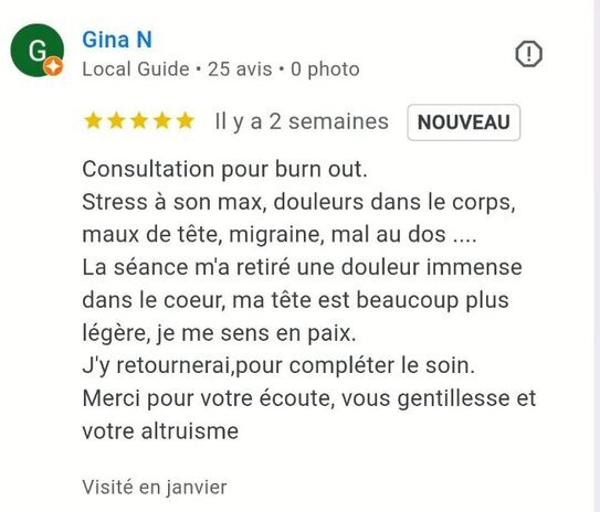 Bonjour. J'ai eu rendez-vous avec vous le 14 juillet, j'ai aimé votre séance, je pense avoir trouvé plus d'apaisement dans ma tête, quant aux douleurs de dos, elles sont moins vives.