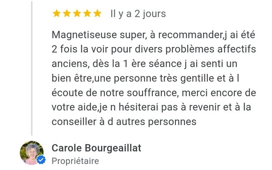 Voilà ce que je peux dire au niveau de mon vécu avec le magnétisme et les séances de Carole....il faut essayer et se rendre compte par soi-même des effets magiques que cela peut avoir sur l'organisme.